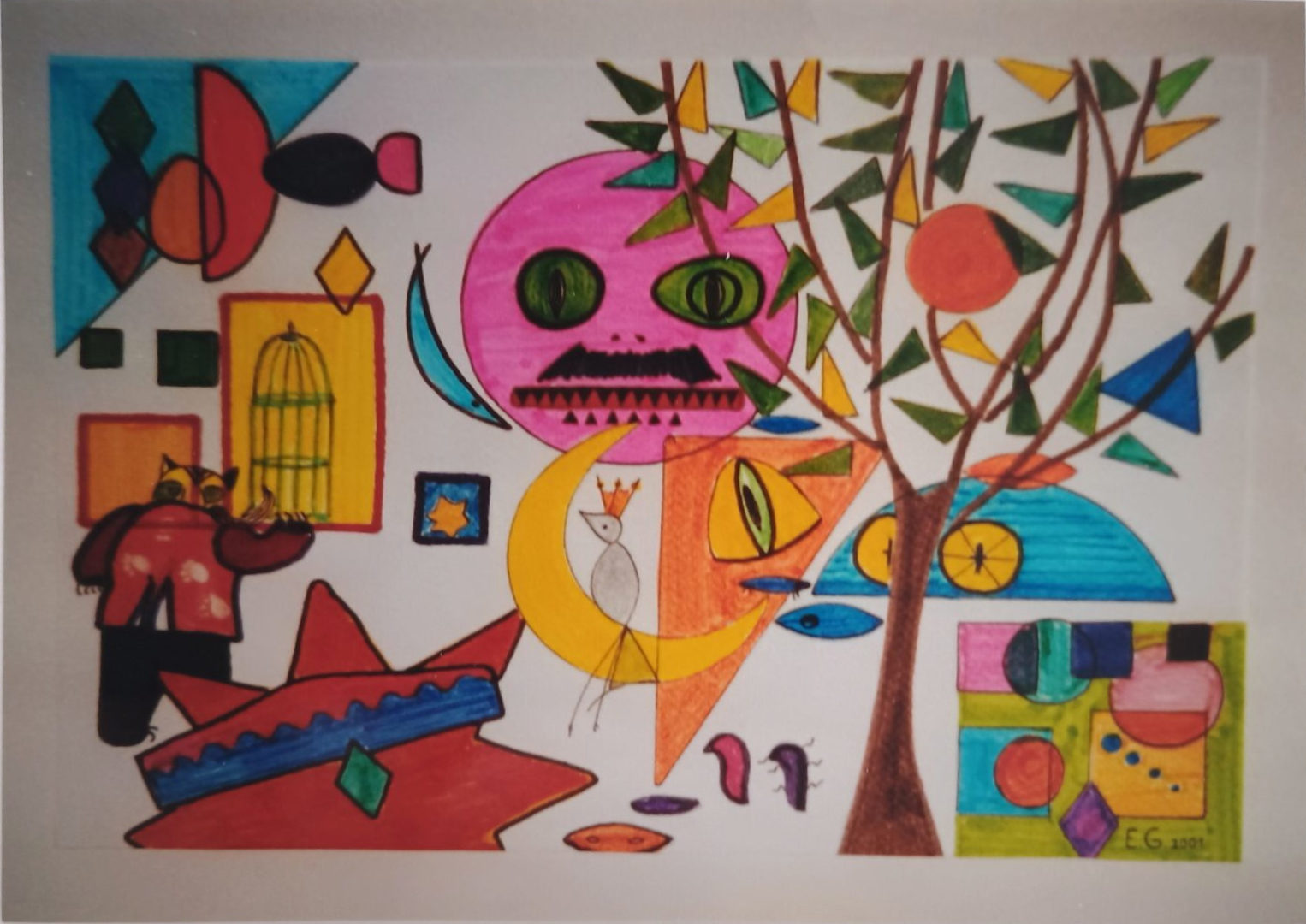 Und dann der Baum, ach, der Baum! Ein elegantes Wesen, voller Stolz und formvollendet wie ein geometrischer Divenstar. Mit seinen spitzen Dreiecken als Blätter weigert er sich, auch nur einen Ast für sie zu senken. „Kein Geäst heute, meine Liebe. Deine Anwesenheit stört meine Symmetrie.“