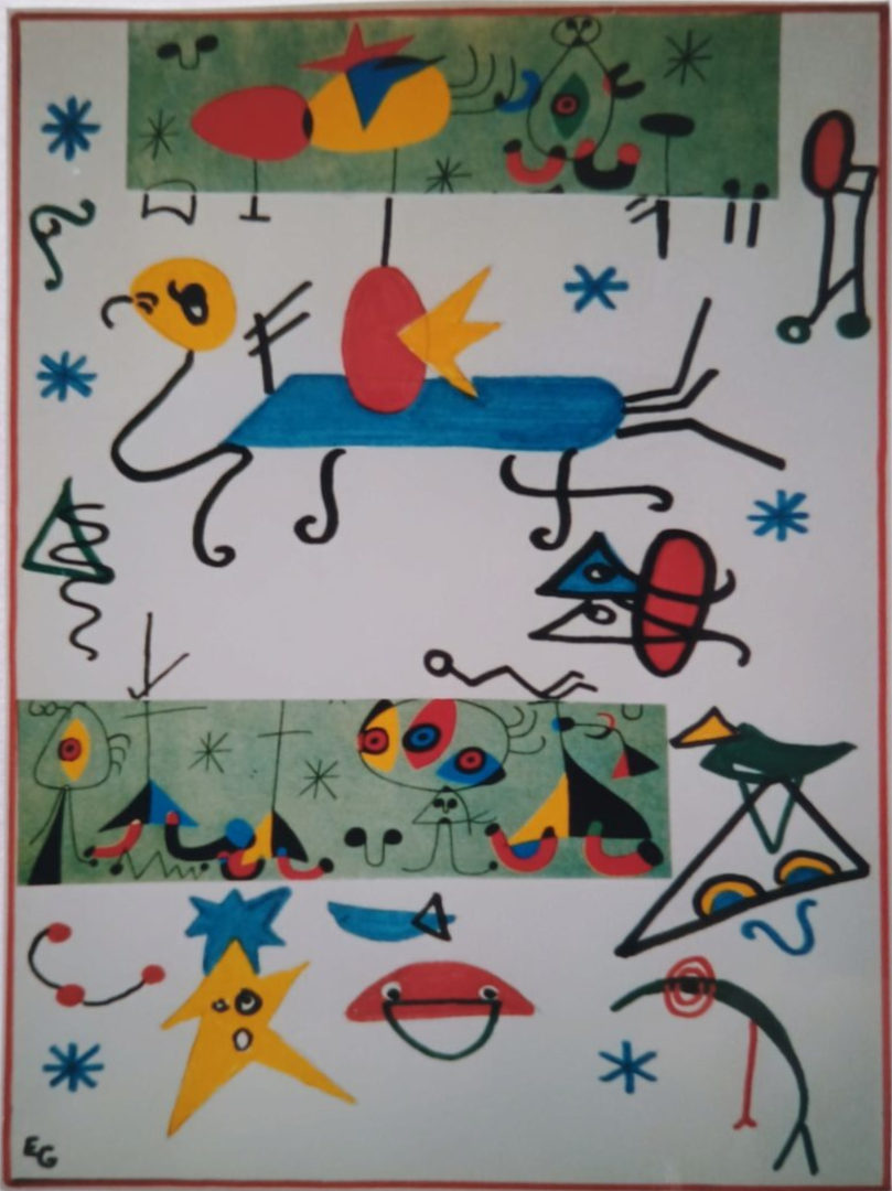 Die Zwillinge wiederum hatten jede Ähnlichkeit mit Menschen aufgegeben und bestanden nun aus einem blauen und einem weißen Dreieck. Harmonisch wie zwei akkurate Origami-Gesellen saßen sie auf einer roten Decke und diskutierten vermutlich über Geometrie oder Picknickregeln für astrale Formen.